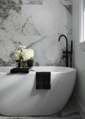 Glossy marble-look tiles for bright and luxurious bathrooms.