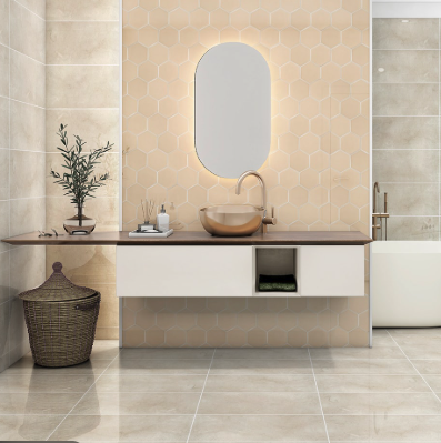Concrete Beige bathroom tiles combine industrial charm with warm, neutral tones. Their cement-inspired finish adds texture and character while maintaining a soft, inviting look. Ideal for modern, minimalist, and luxury bathrooms, these tiles complement wood and matte black fittings perfectly.